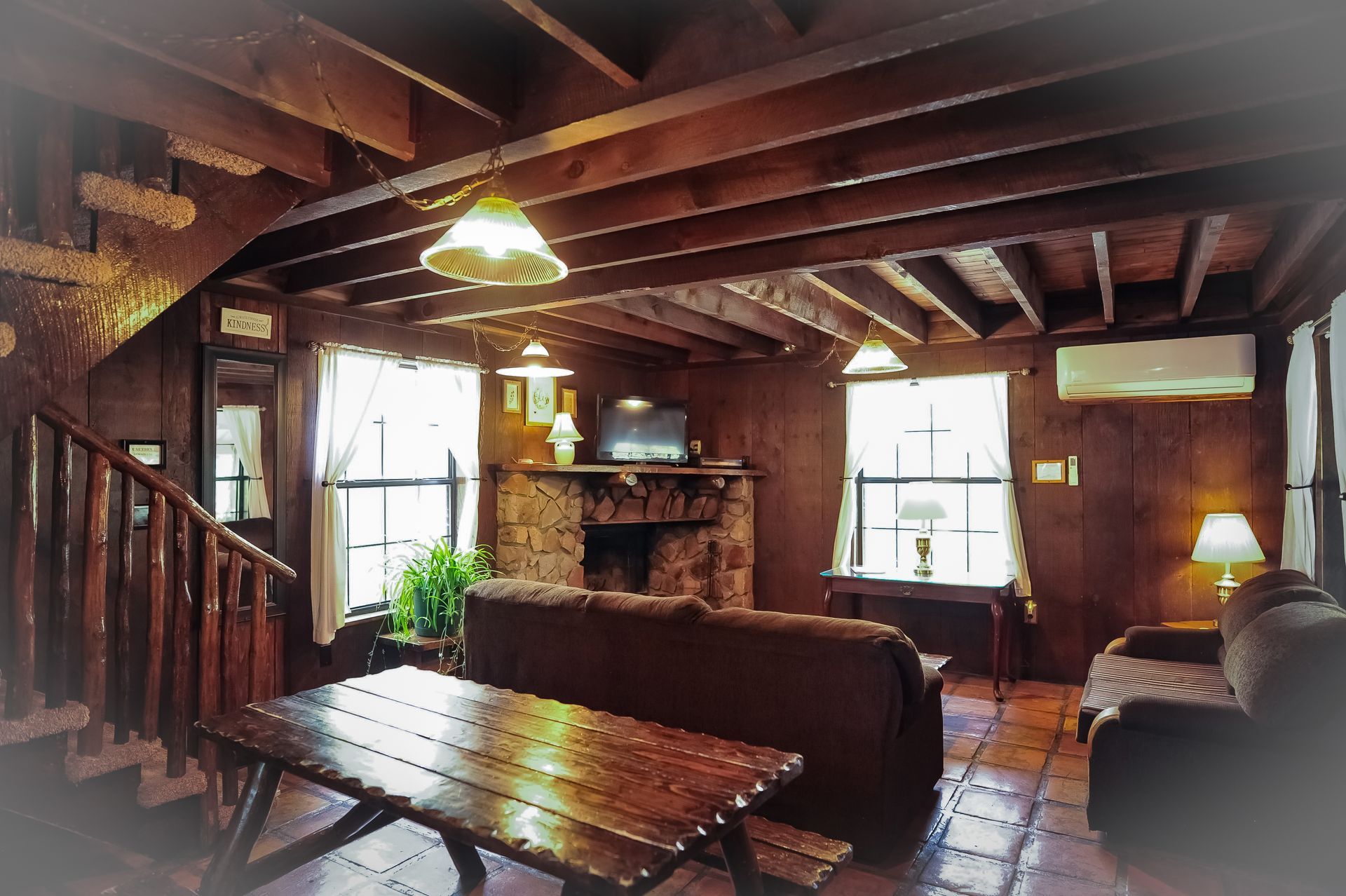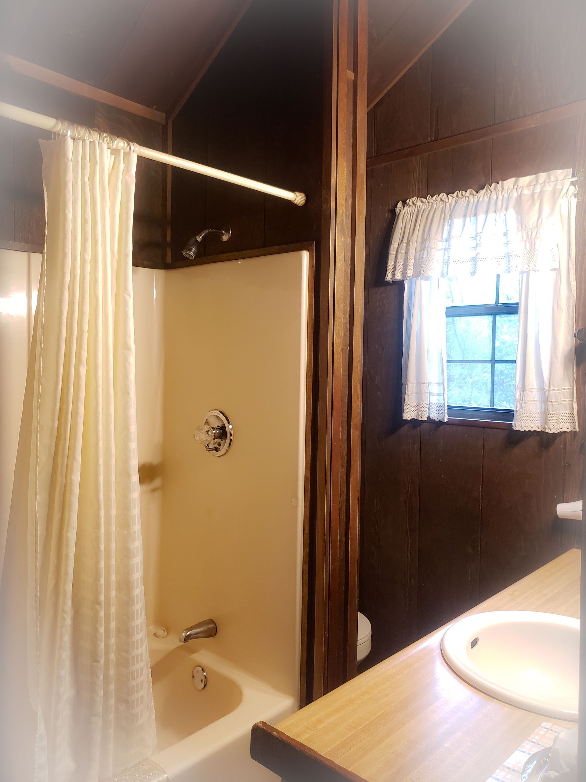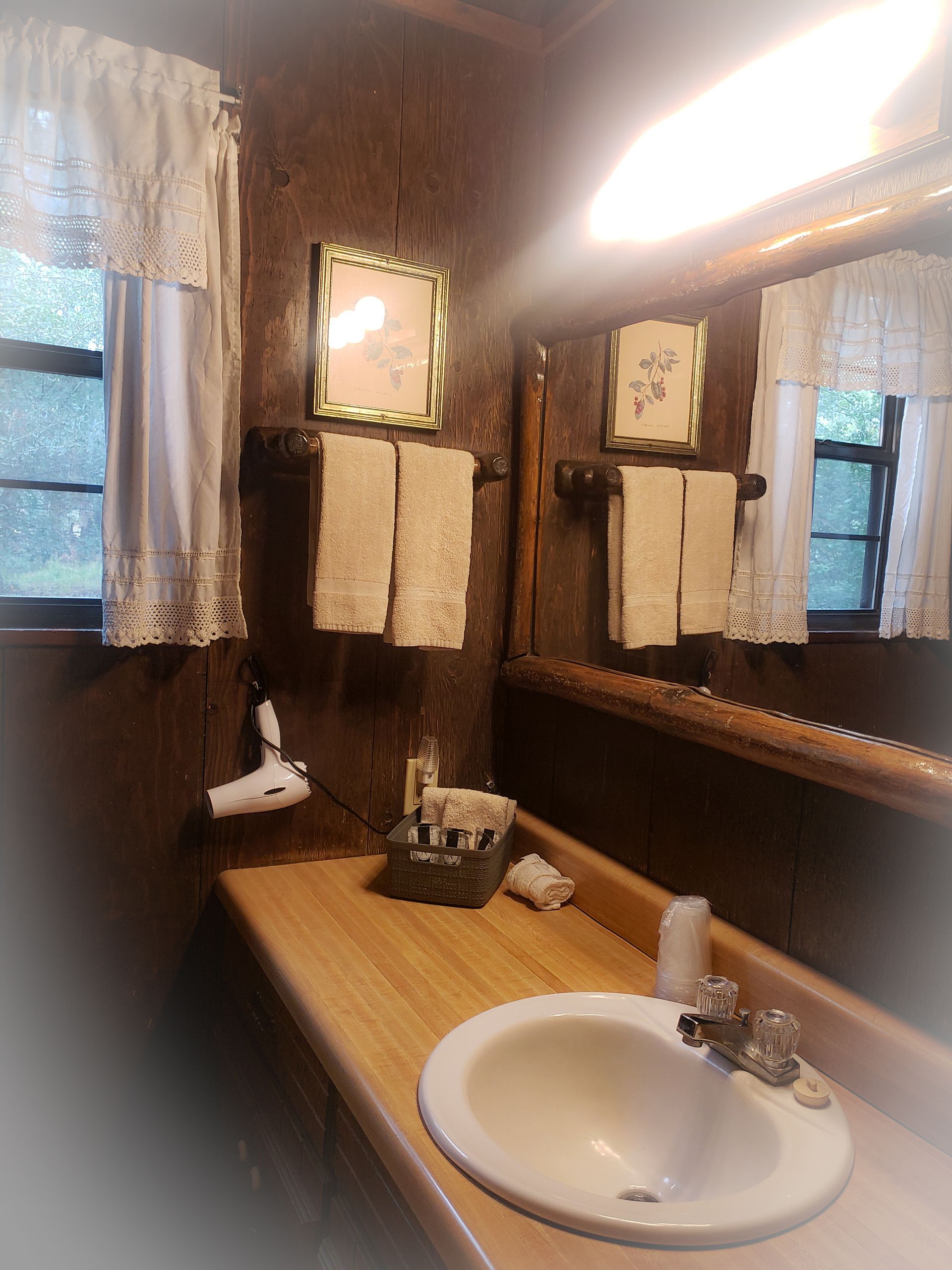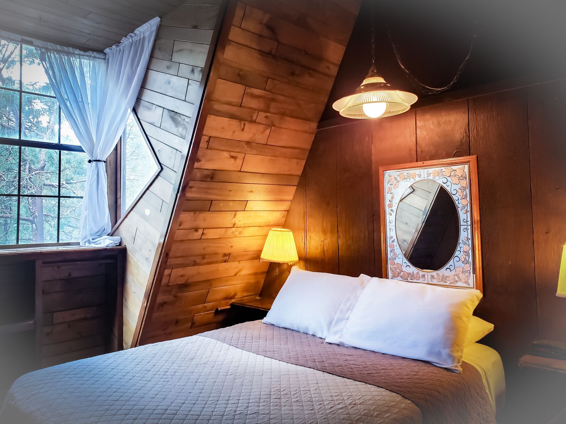 Experience the serenity of nature, bird watch while you relax in the cool breezes of the ponderosa pines. Cabin eight is a large split level kitchen cabin with two bedrooms upstairs. One bedroom is private with a queen size bed. The other bedroom is an open loft type with a double bed. The front porch has a picnic table, birdfeeder, two outdoor chairs & a BBQ grill is available. The kitchen, fireplace, and a living room area are located on the lower level.