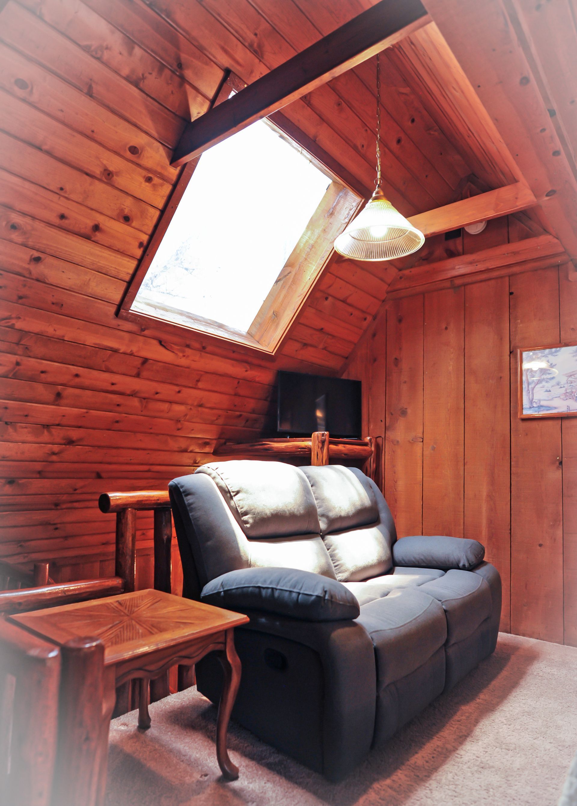 Experience the serenity of nature, bird watch while you relax in the cool breezes of the ponderosa pines. Cabin eleven is a very unique split level cabin with a king size bed in the upstairs bedroom which also has a French door to an outside covered balcony, complete with outdoor furniture. This cabin has a kitchenette and a woodstove downstairs. The front porch has a picnic table, birdfeeders, two outdoor Adirondack chairs & a BBQ grill is available.