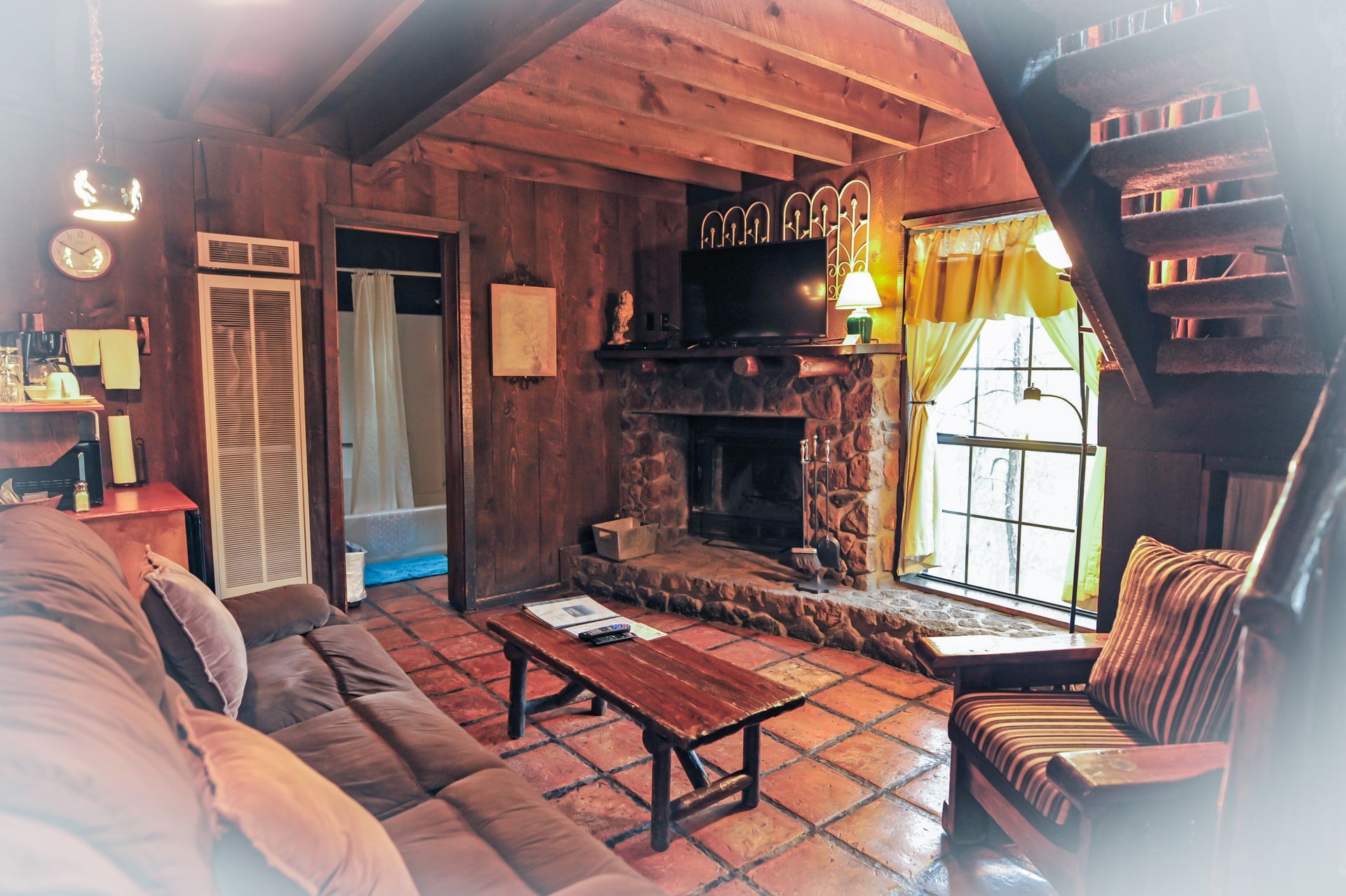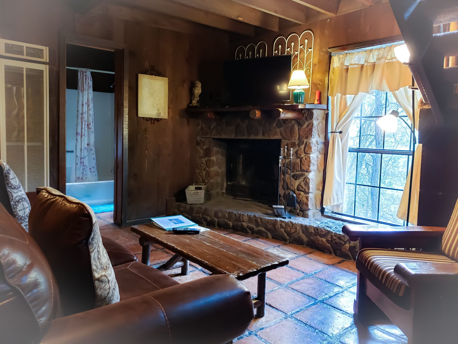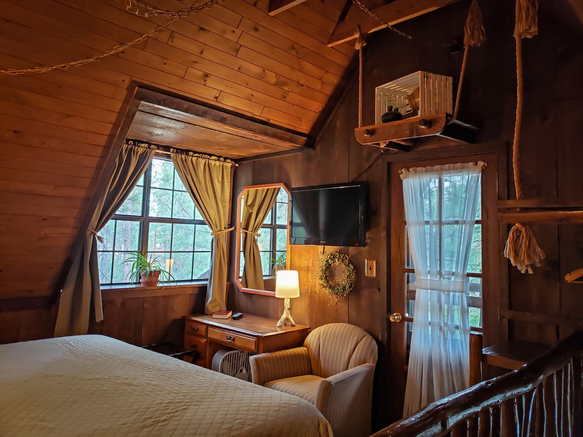 Experience the serenity of nature, bird watch while you relax in the cool breezes of the ponderosa pines. Cabin four is a split level cabin with a king size bed upstairs and a French door to access a covered balcony. Cabin 4 does not have a kitchen, but it does have a coffee counter and a stone fireplace. The front porch is equipped with a birdfeeder, two Adirondack chairs & a BBQ grill is available.