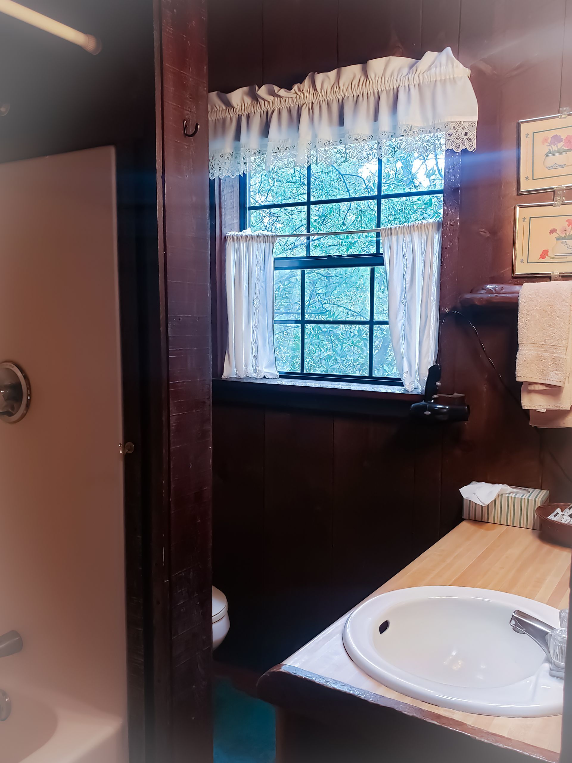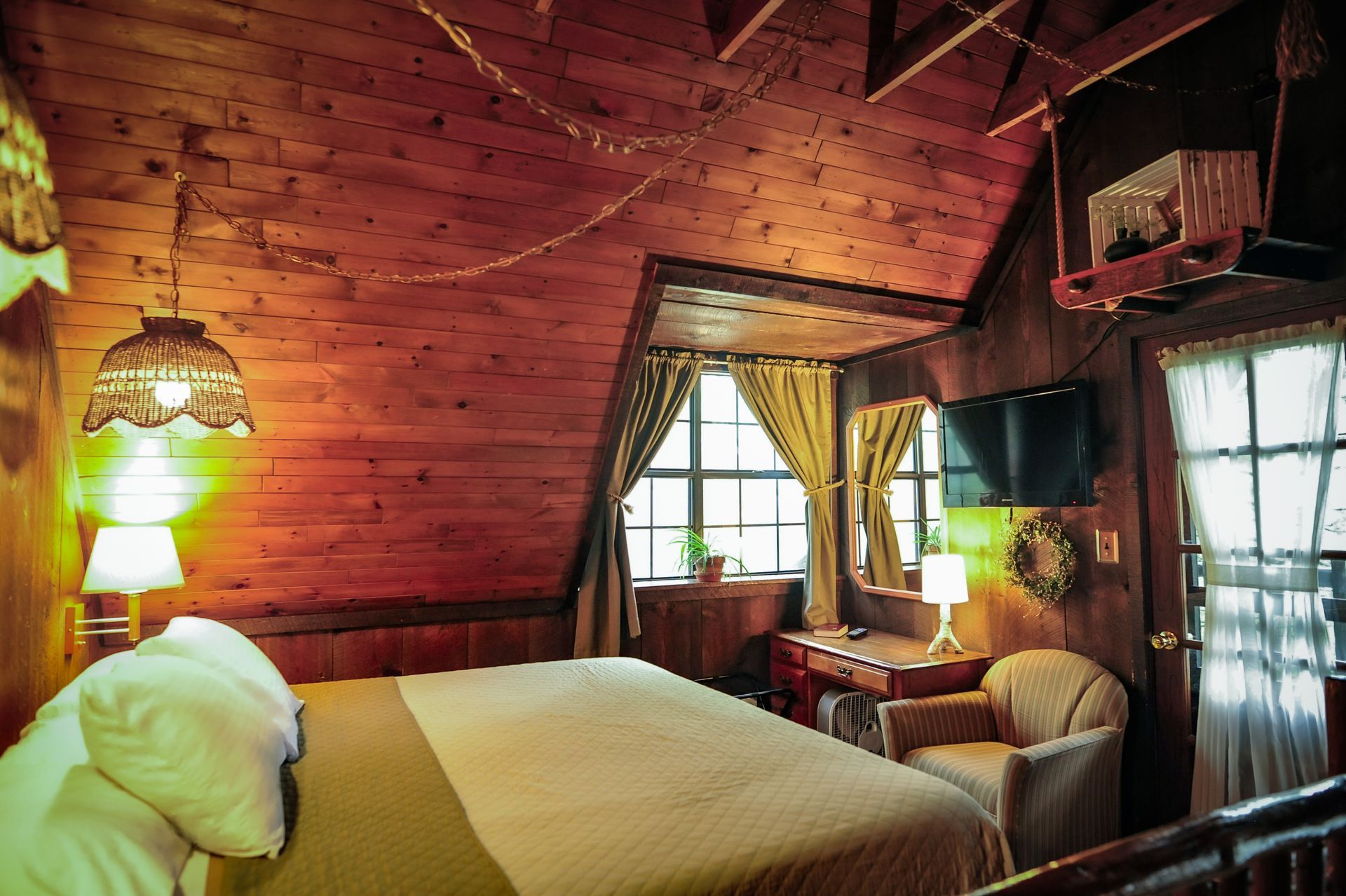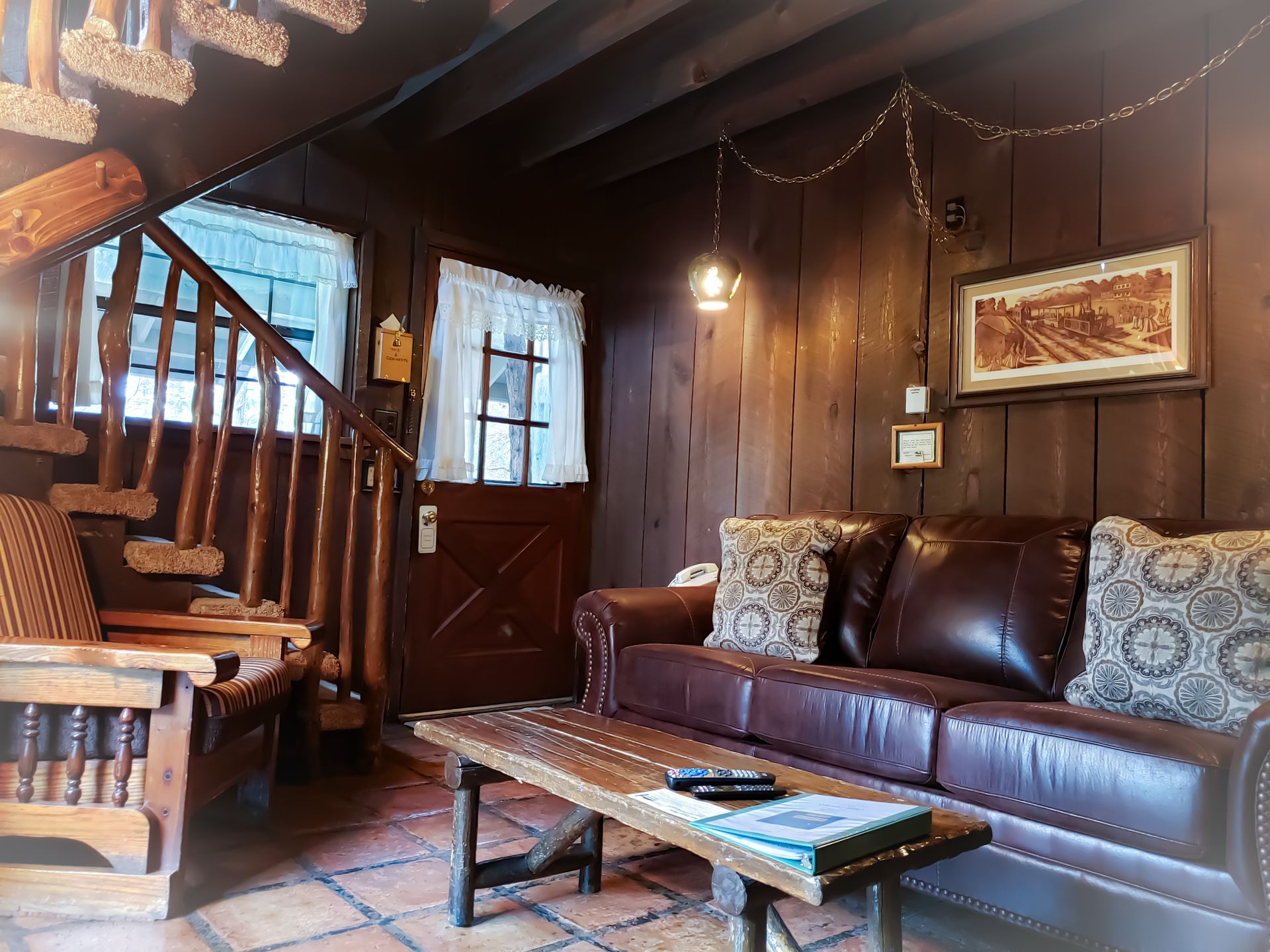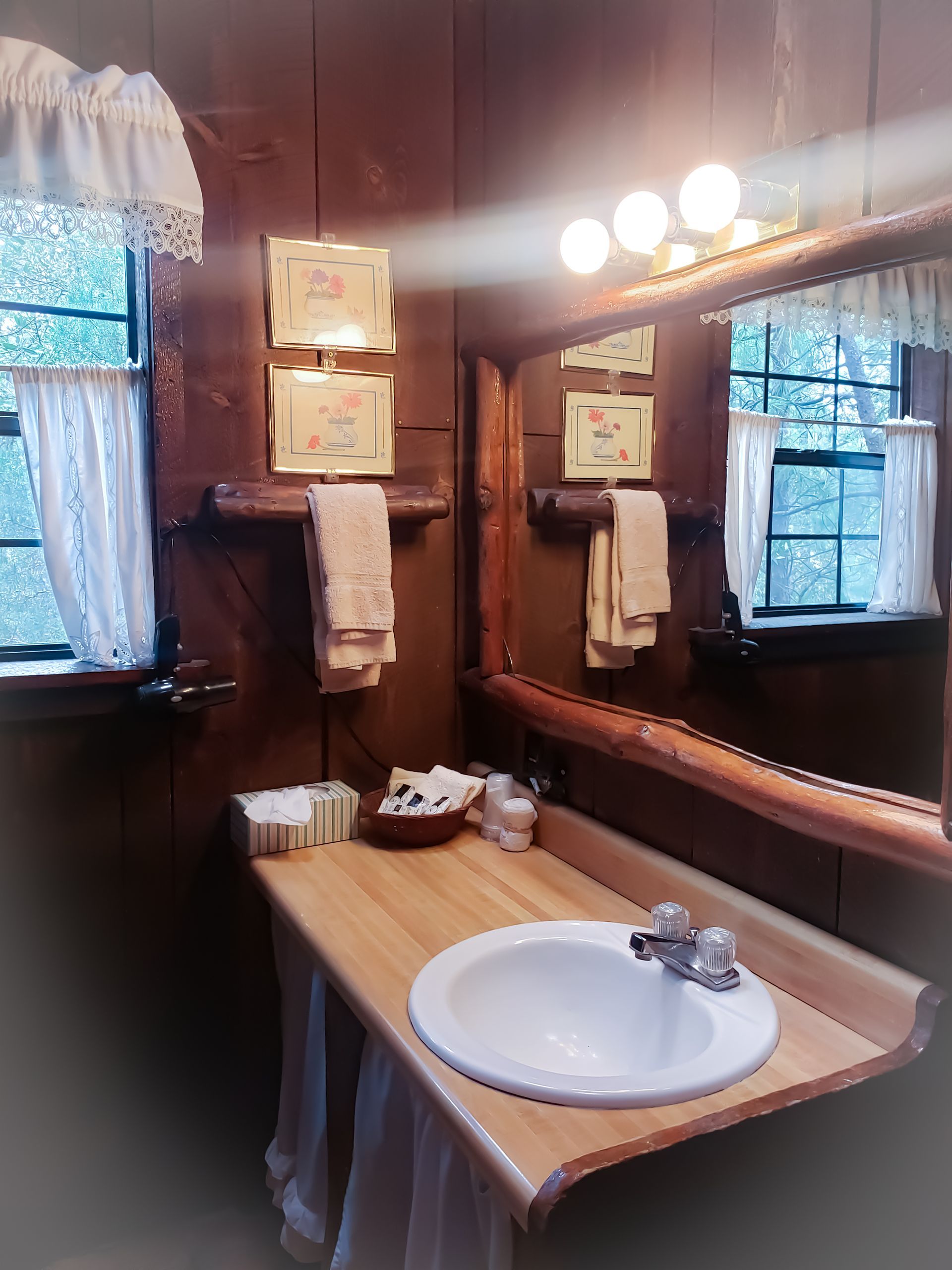 Experience the serenity of nature, bird watch while you relax in the cool breezes of the ponderosa pines. Cabin four is a split level cabin with a king size bed upstairs and a French door to access a covered balcony. Cabin 4 does not have a kitchen, but it does have a coffee counter and a stone fireplace. The front porch is equipped with a birdfeeder, two Adirondack chairs & a BBQ grill is available.