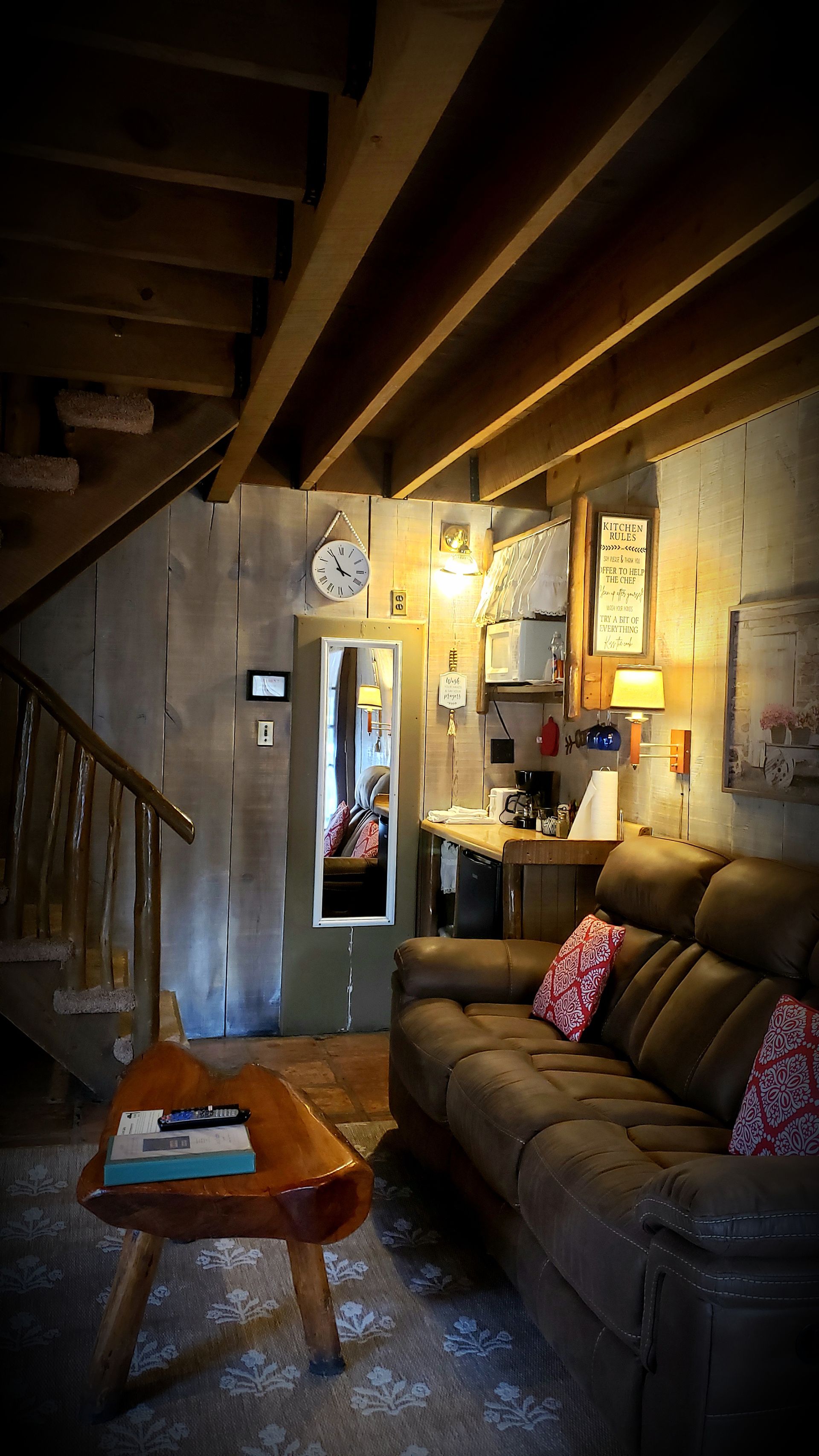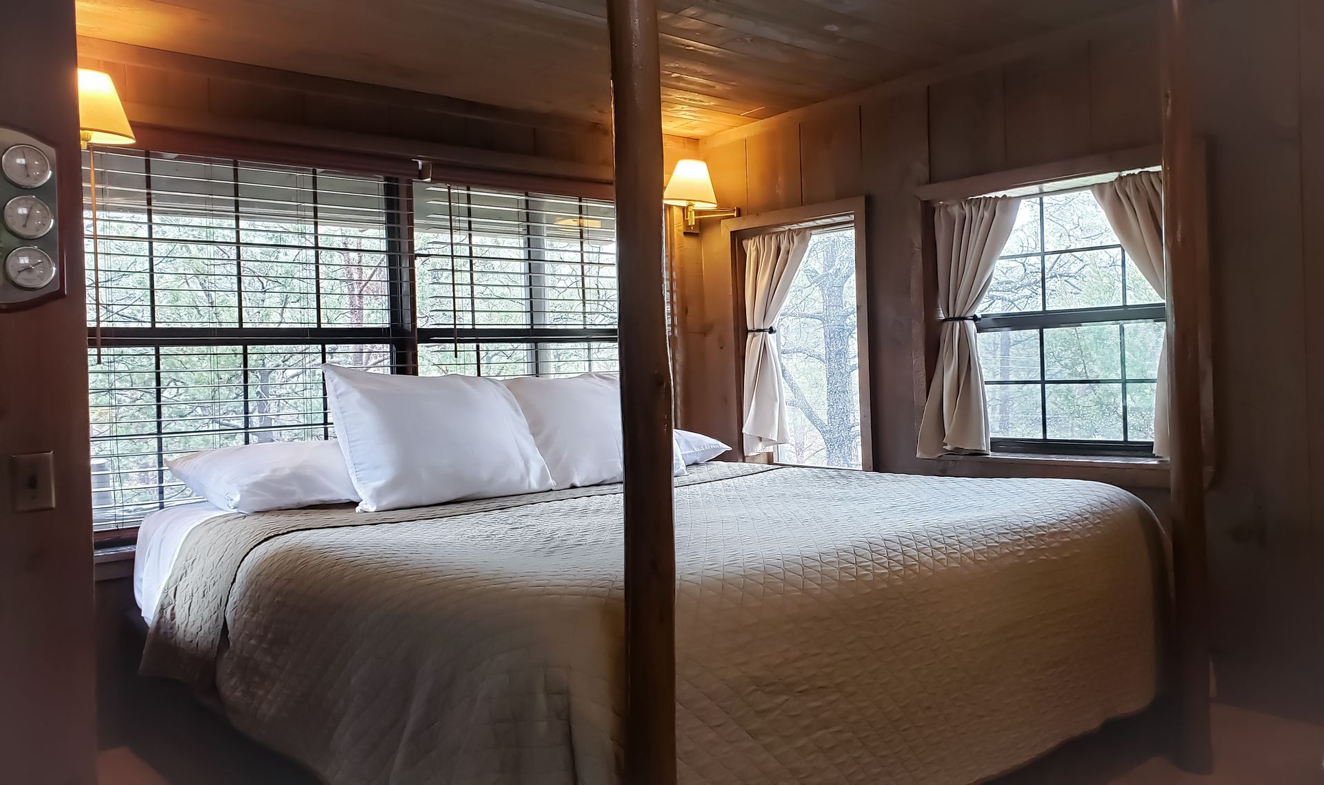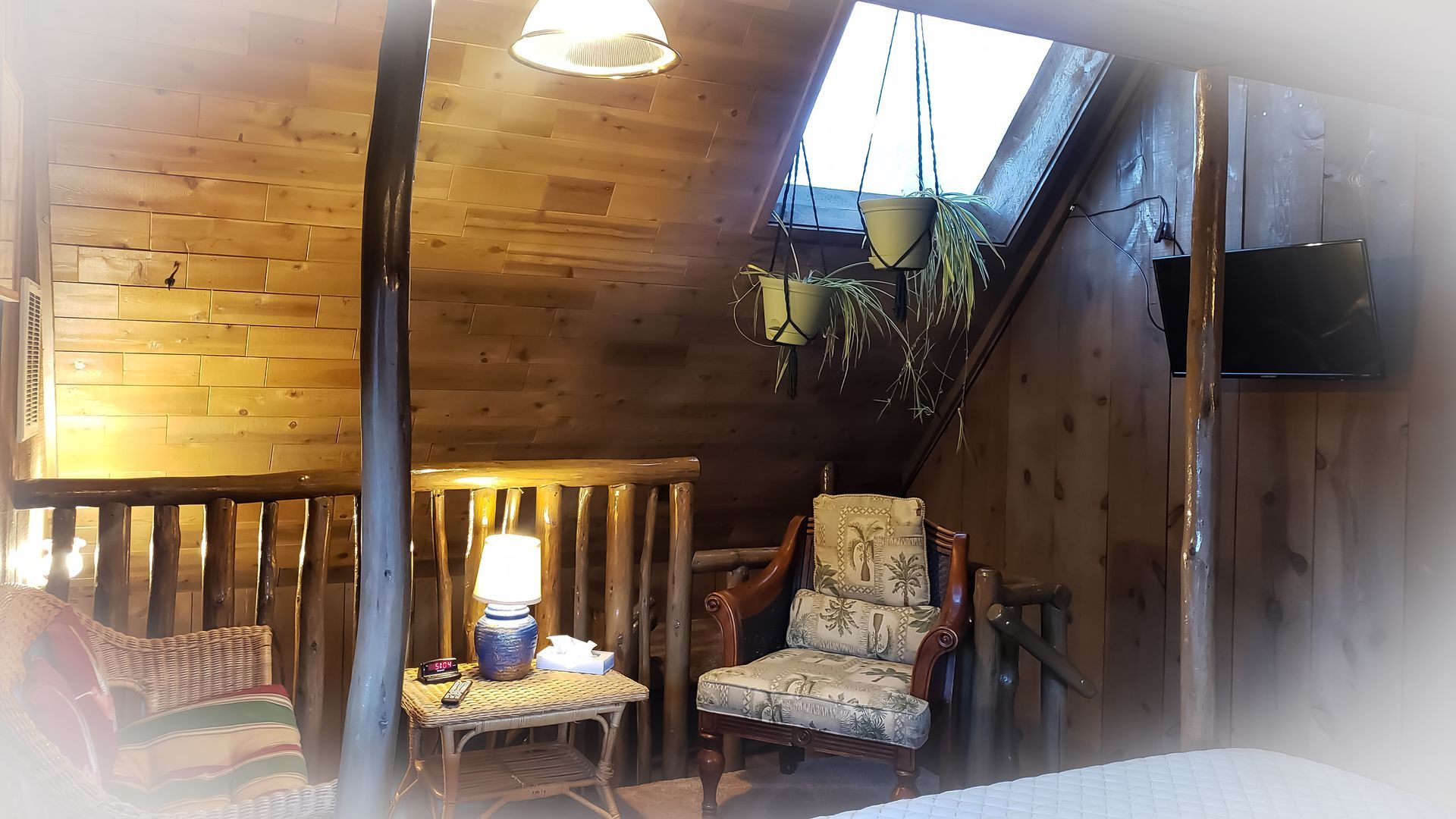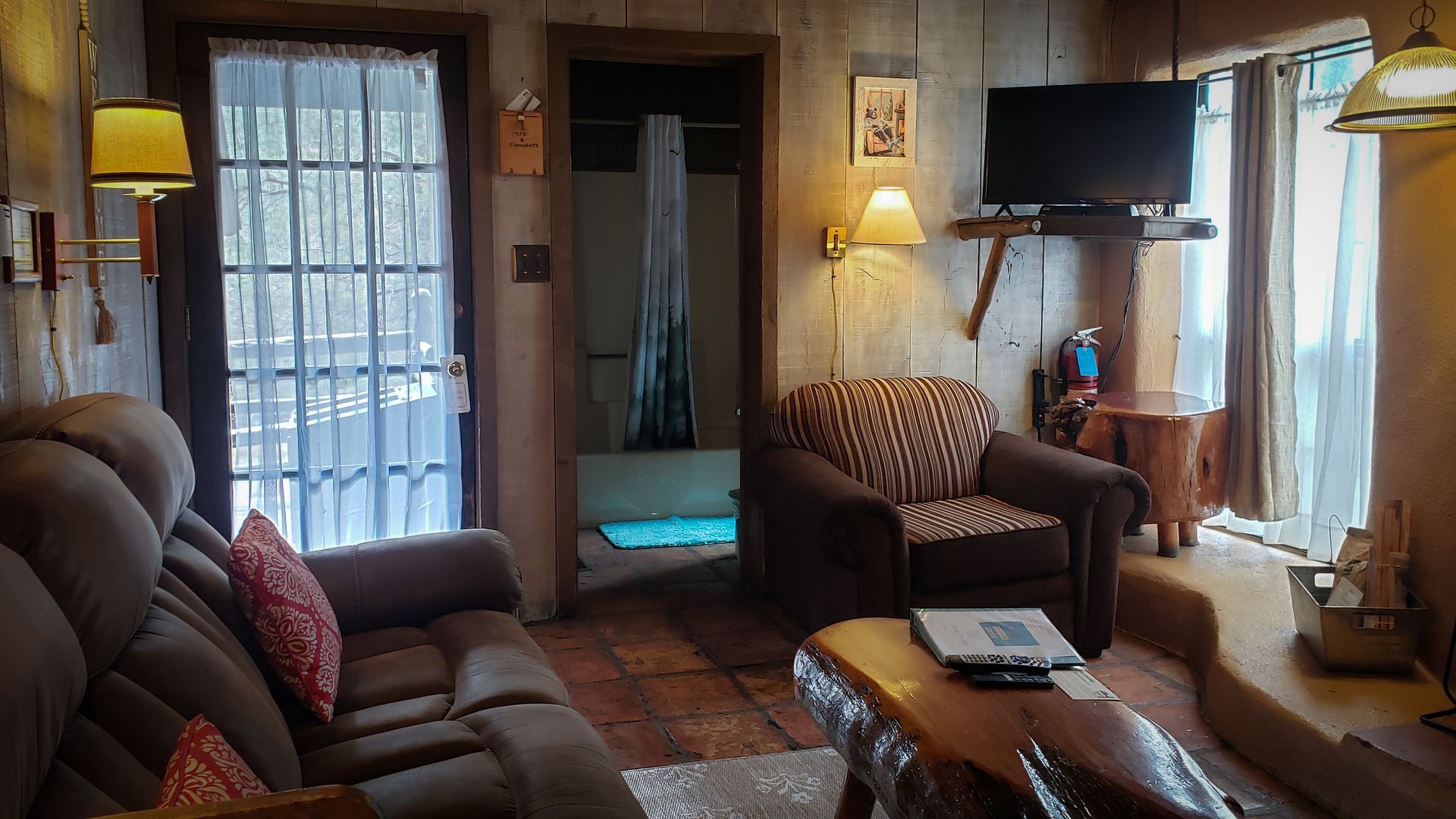 Experience the serenity of nature, bird watch while you relax in the cool breezes of the ponderosa pines. Cabin A is a split level cabin with an elevated king size bed upstairs. It has a skylight and windows galore. Cabin A has a refrigerator, microwave, coffee counter and a southwest-style fireplace. The front porch is loaded with a picnic table, bird feeder, Adirondack chairs & a BBQ grill is available.