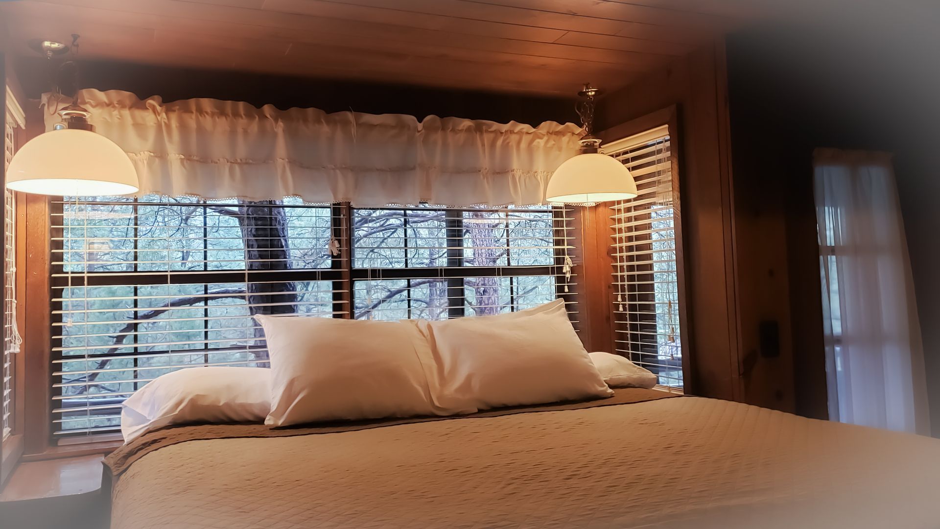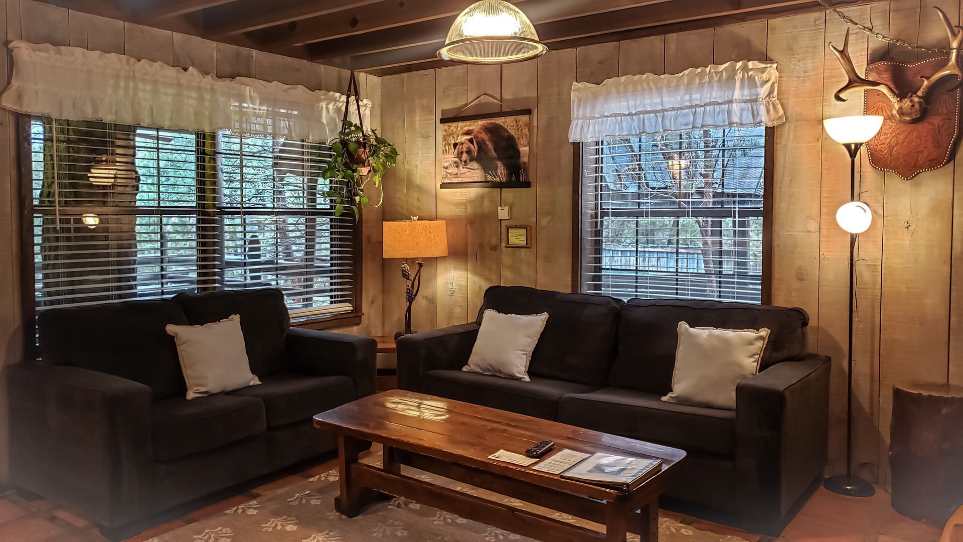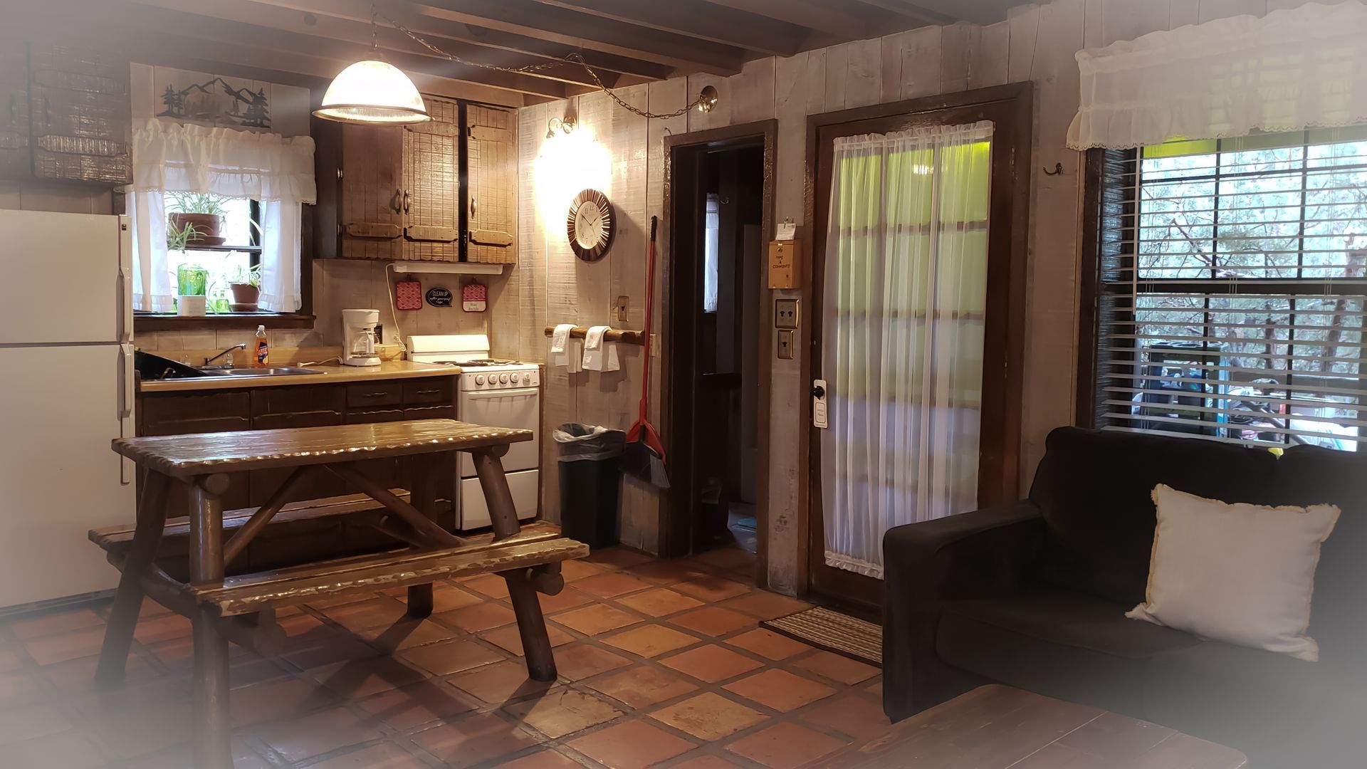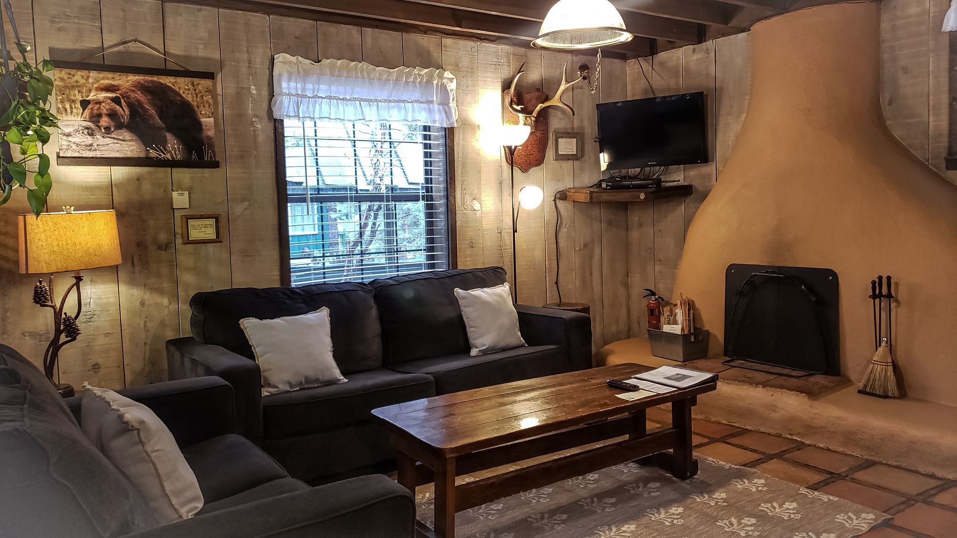 Experience the serenity of nature, bird watch while you relax in the cool breezes of the ponderosa pines. Cabin C is our largest split level cabin. It features a short path leading to a covered bridge, then a few more step and you are on the front porch, and at entrance of this cabin. This porch has a bird feeder, picnic table, Adirondack chairs, and a tree growing through the porch and upper balcony & a BBQ grill is available. Upstairs are two private bedrooms with a King size bed in each room. Each bedroom has an access French door leading to a large covered balcony complete with four outside Adirondack chairs. Downstairs is a kitchen, a large living room, and a Spanish-style kiva fireplace.