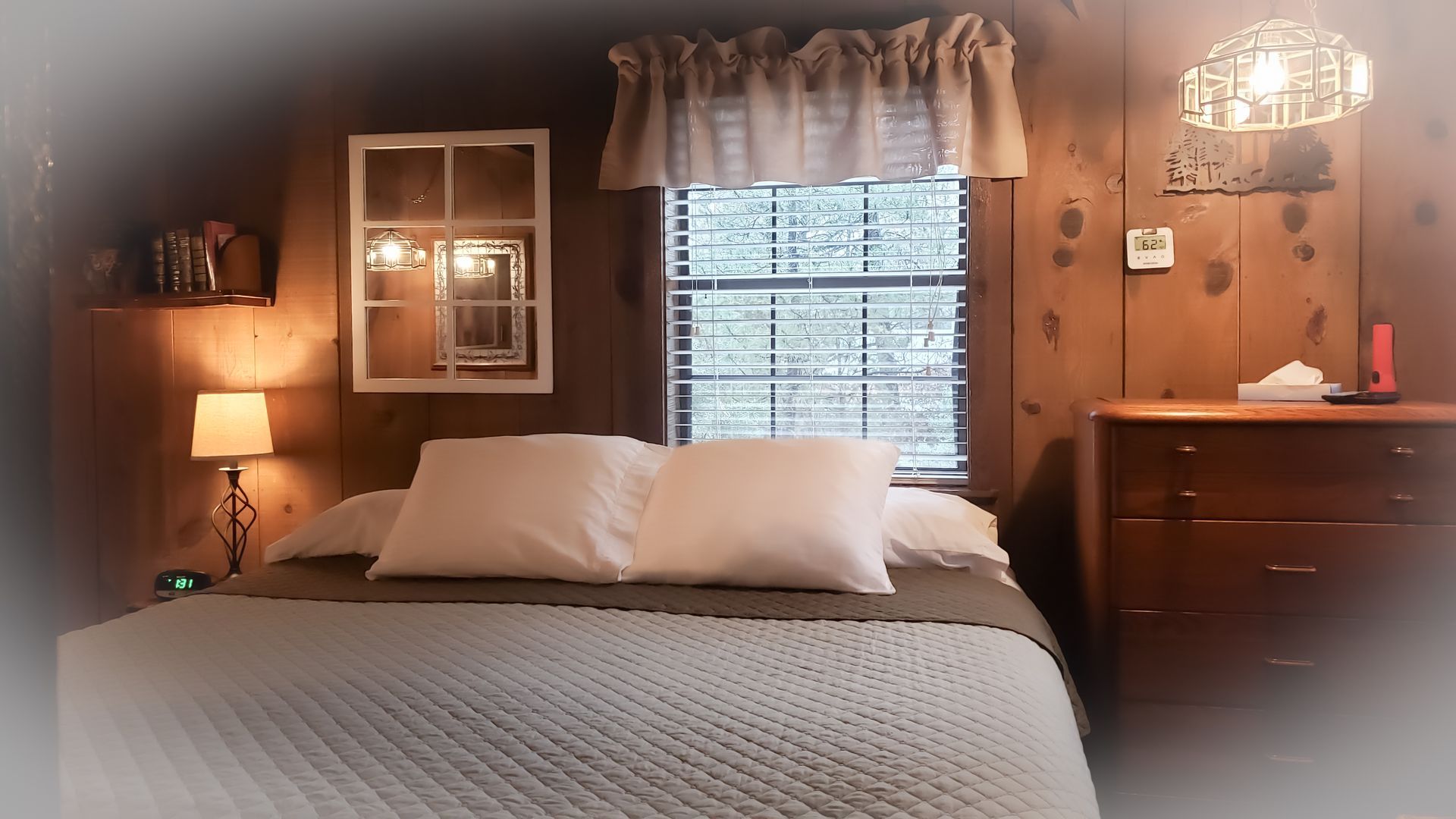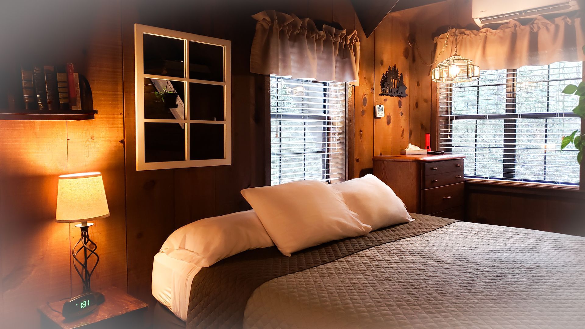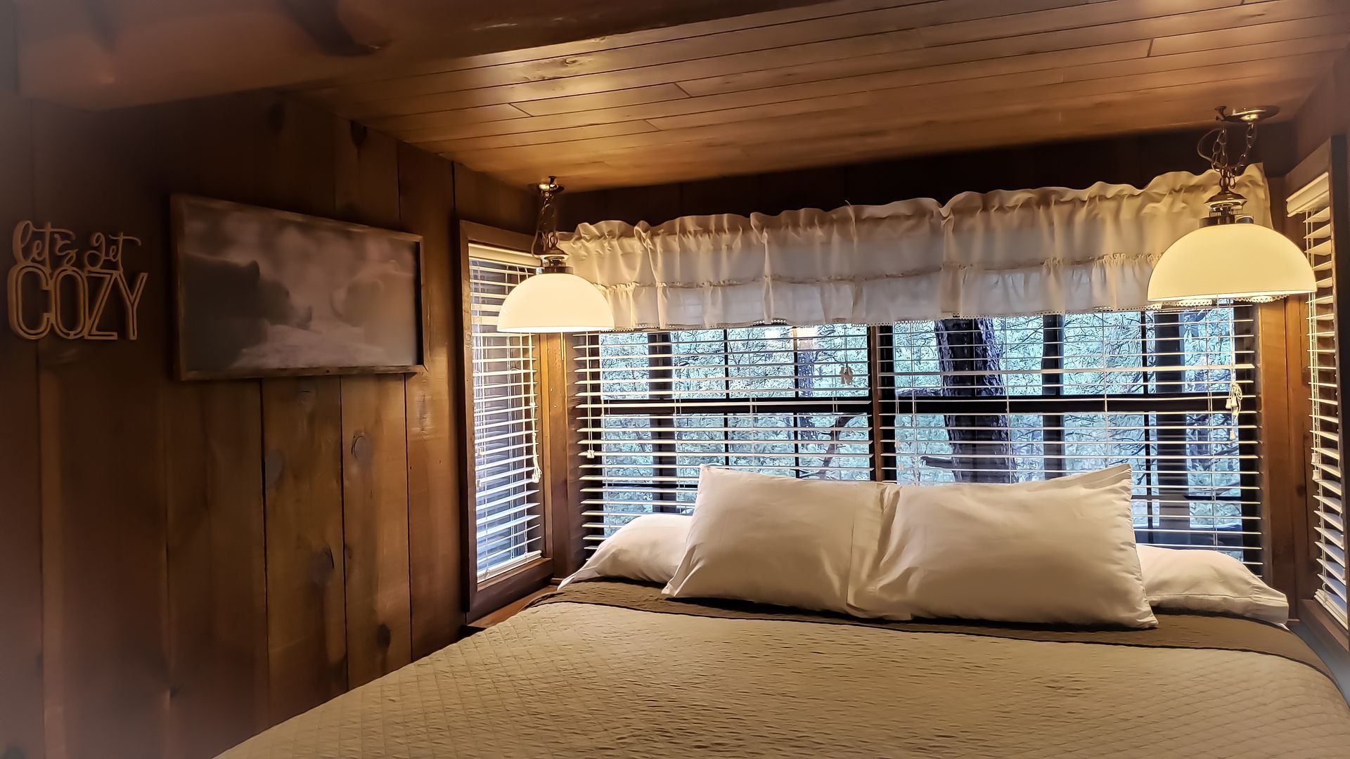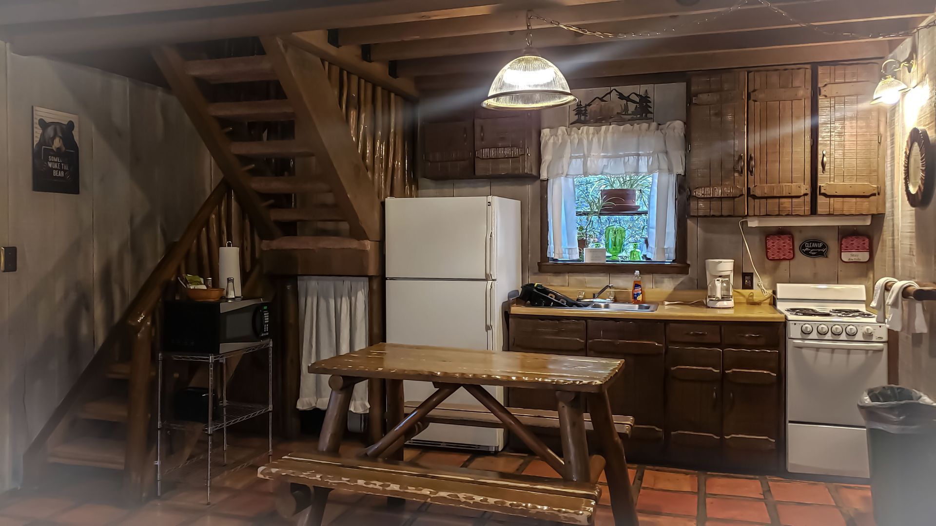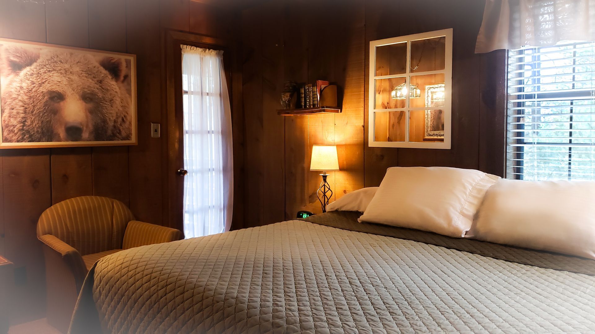 Experience the serenity of nature, bird watch while you relax in the cool breezes of the ponderosa pines. Cabin C is our largest split level cabin. It features a short path leading to a covered bridge, then a few more step and you are on the front porch, and at entrance of this cabin. This porch has a bird feeder, picnic table, Adirondack chairs, and a tree growing through the porch and upper balcony & a BBQ grill is available. Upstairs are two private bedrooms with a King size bed in each room. Each bedroom has an access French door leading to a large covered balcony complete with four outside Adirondack chairs. Downstairs is a kitchen, a large living room, and a Spanish-style kiva fireplace.